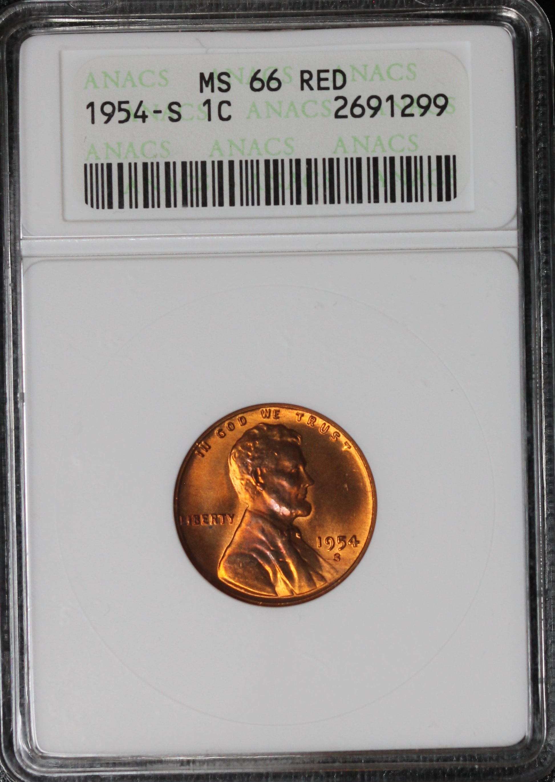 1954-S Lincoln Wheat Cent, ANACS MS66RD