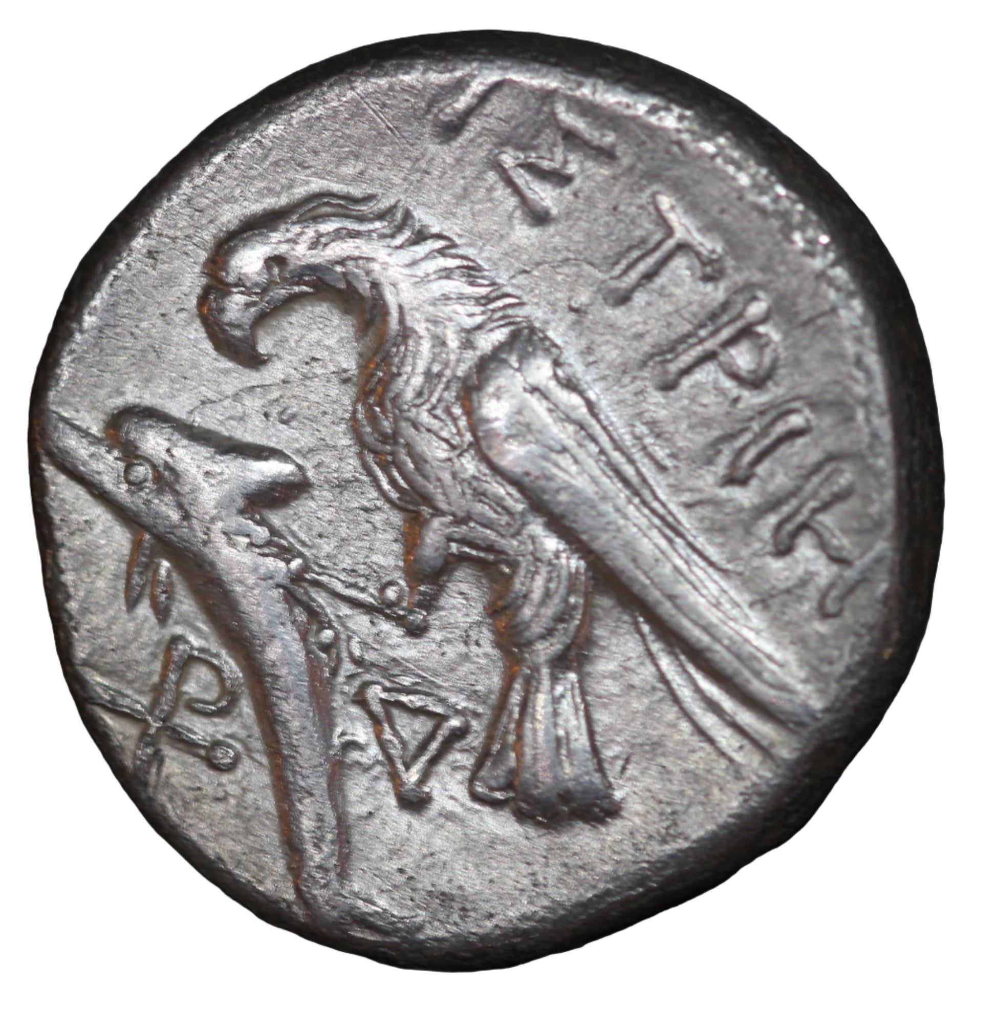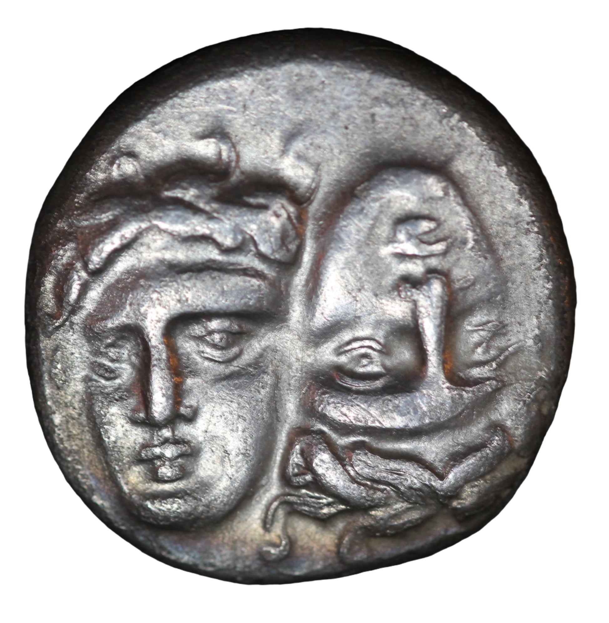 Moesia Istros 4th Century BC AR Drachm Minted in Istros, a prosperous Greek colonial city in ancient Moesia (modern Bulgaria), this silver drachm dates to the 4th century BC. Obv. Facing male heads/ sea eagle grasping dolphins with talons. The piece's historical authenticity, rarity, and provenance make it a distinguished acquisition for collectors seeking genuine artifacts that illuminate the economic structures and cultural achievements of classical antiquity.