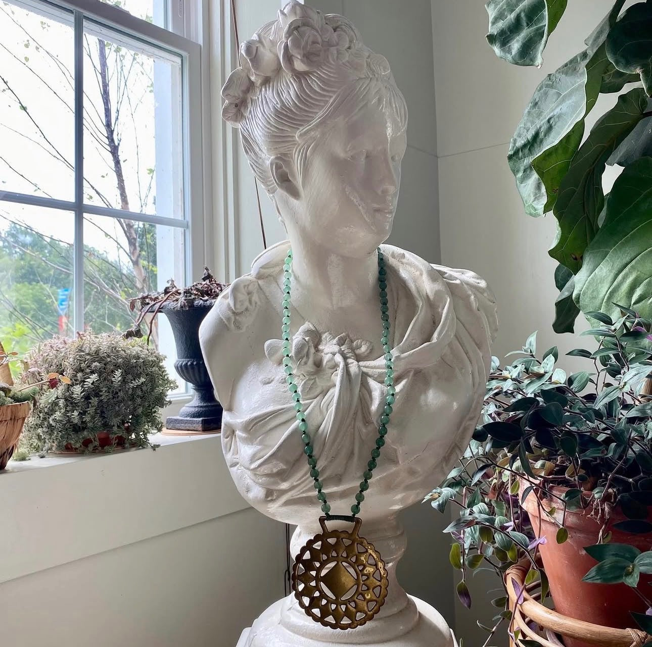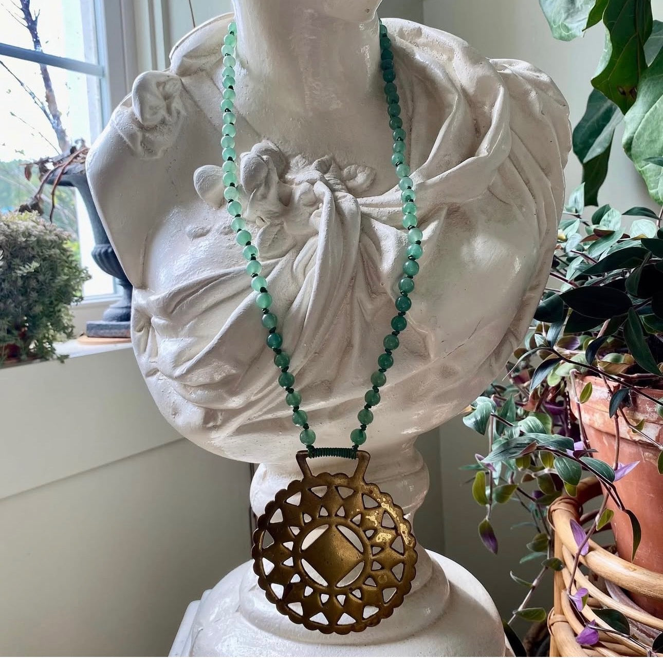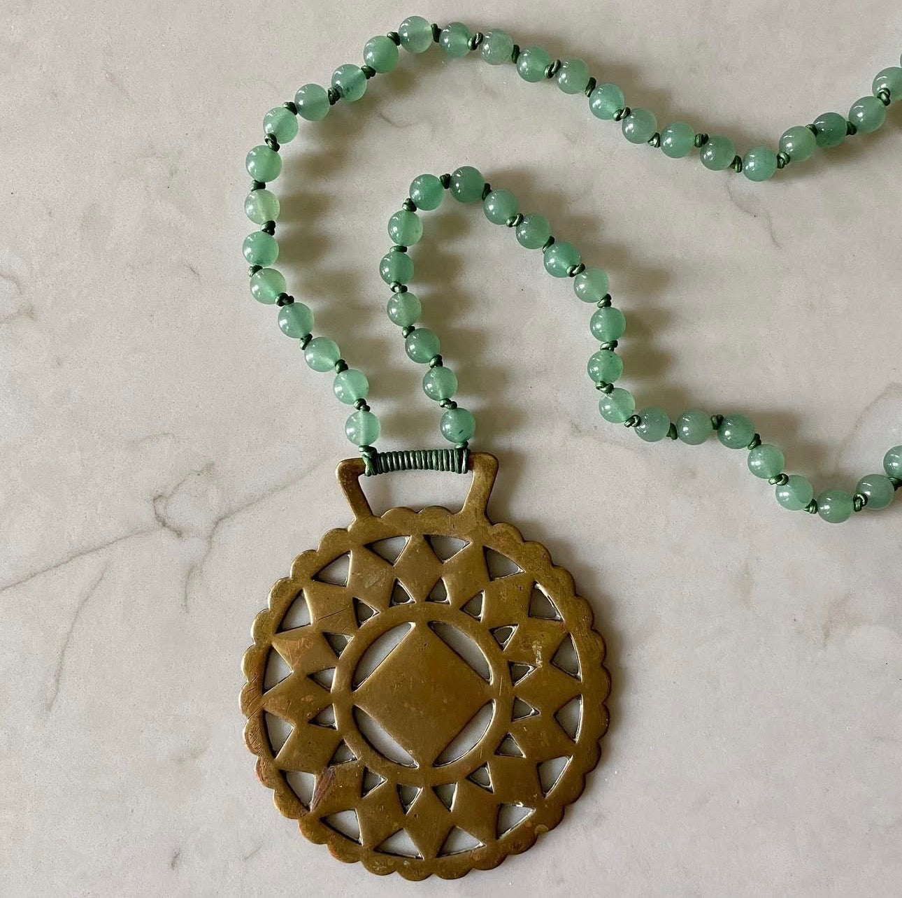 Authentic green quartz round beads hand knotted with a green natural leather cord. Finished off with an antique horse brass from England to finish off the piece.